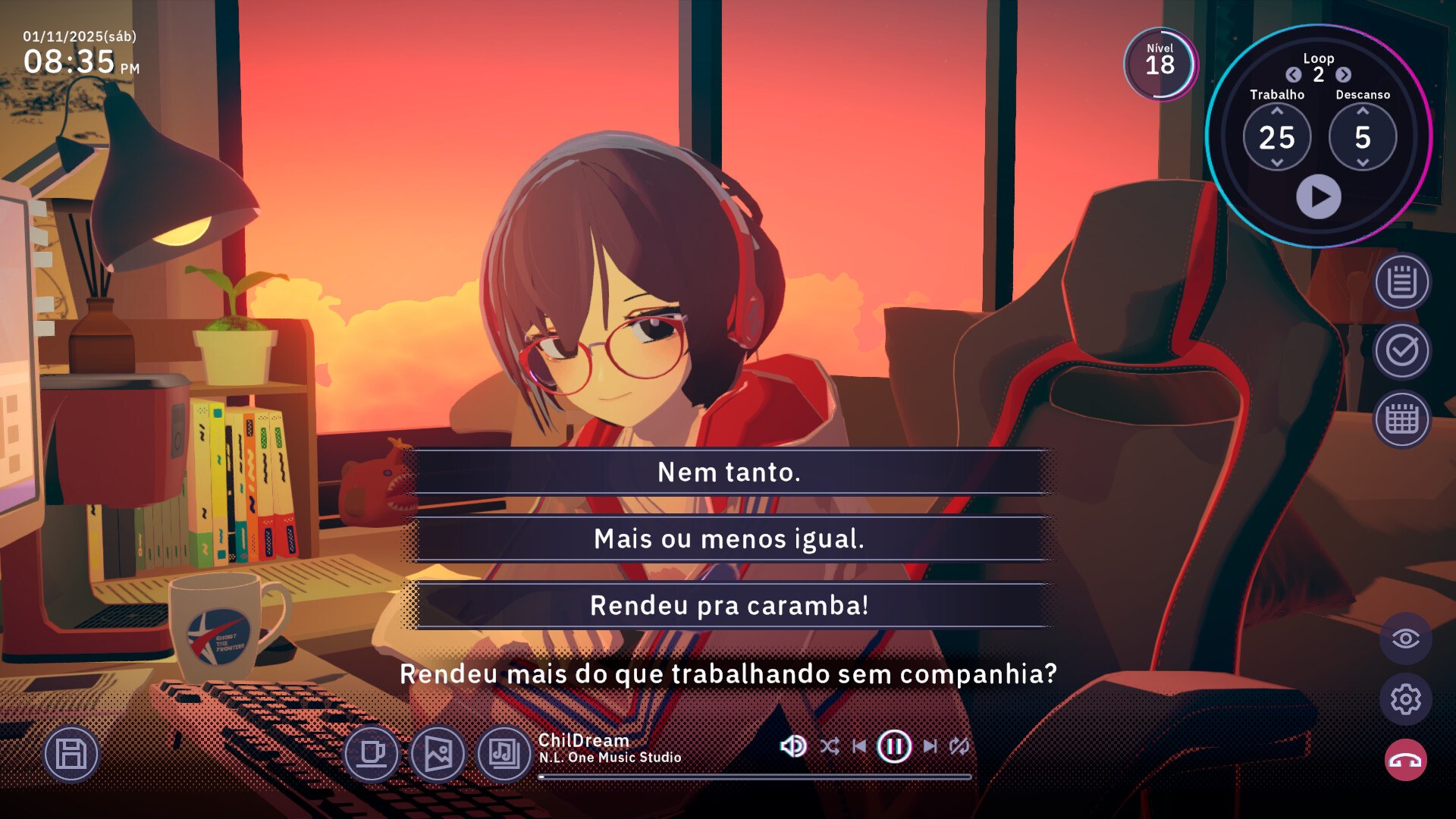 Chill with You : Lo-Fi Story é um sound novel focado em produtividade, onde você trabalha na sua mesa ao lado de Satone, uma garota imaginativa que adora escrever romances. Ajuste as músicas Lofi, os sons ambiente e os cenários que refletem o estado emocional dela para criar o ambiente perfeito de concentração.