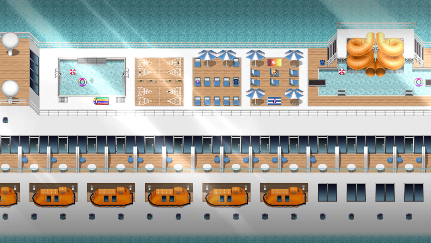 Let your players choose if they want to relax on a lounge chair under an umbrella on one of the ship’s decks or explore the halls with patterned rugs and sea-themed paintings before enjoying a concert on the ship’s stage.