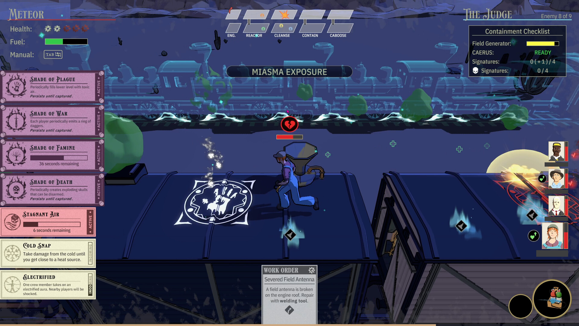 Your engine has seen better days, and these attacks from ghost mortars aren't helping. Repair broken systems, divert steam pressure, and prevent reactor meltdowns to keep your train chugging along — and do it fast, because these malfunctions escalate quickly. (We recommend welding that hole in the roof before the whole thing collapses.)