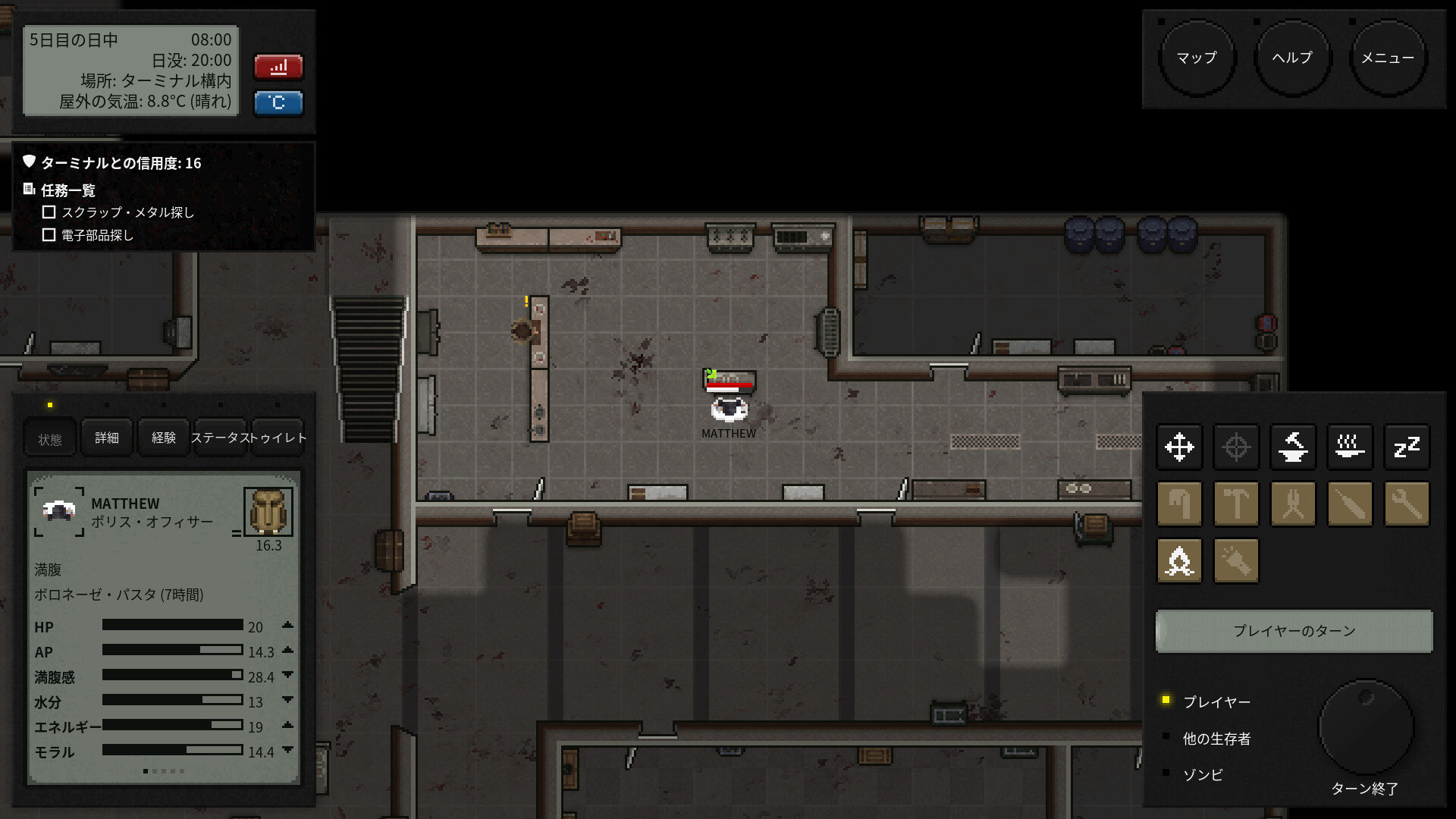 ターミナルにいる生存者には、それぞれ固有のバックストーリーと能力がある。ターミナルを守る上で重要な役割を果たすものもあれば、食料管理や医療面で役立つものもある。会話を交わし、身の上話を聞いて、彼らに手を差し伸べよう。