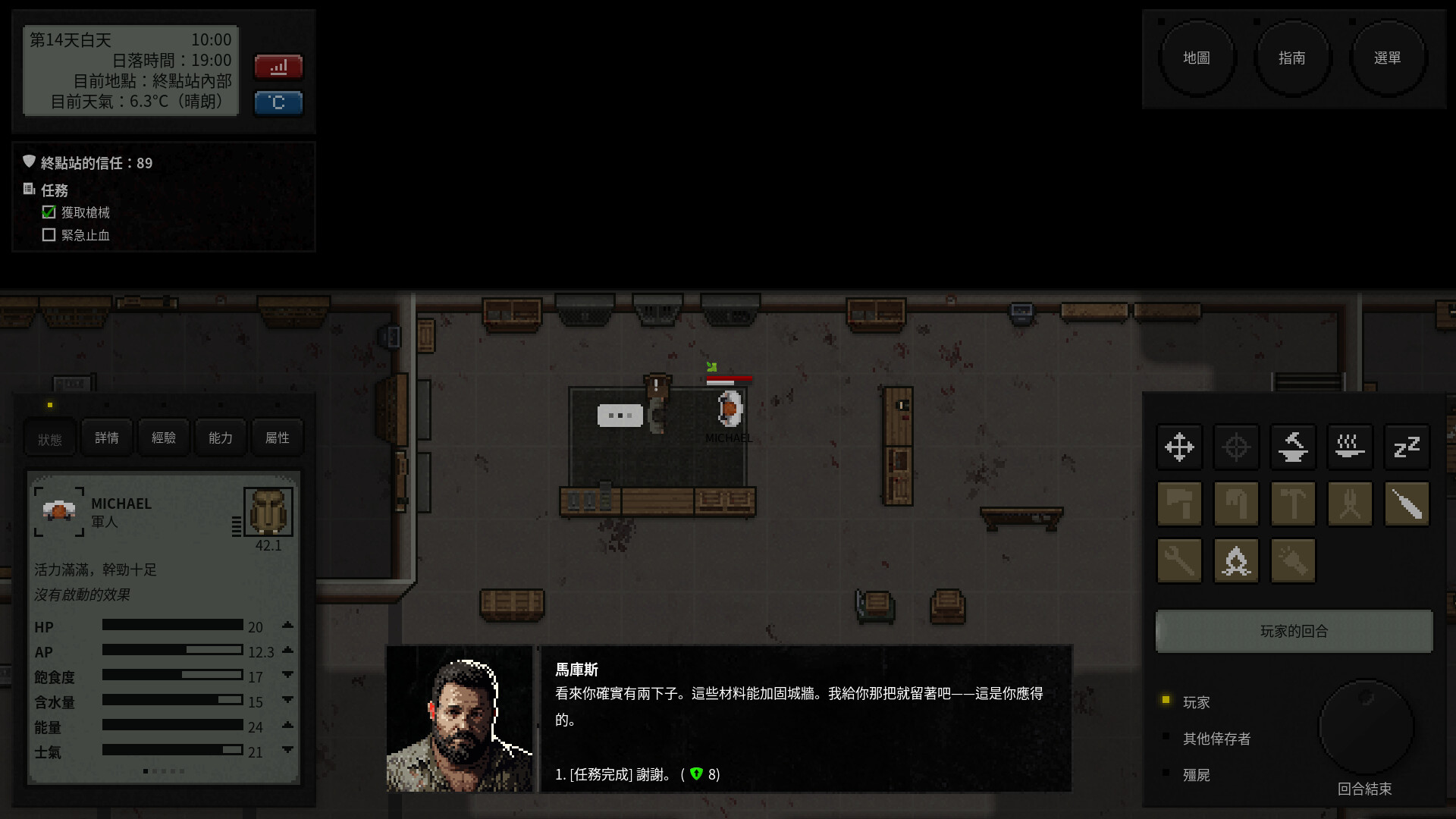 終點站的每位倖存者都有屬於他們的過往經歷和獨有的能力。有些人肩負著保衛車站的責任,也有人負責管理食物和醫療資源。和他們互動,了解他們的故事,並給他們提供協助。