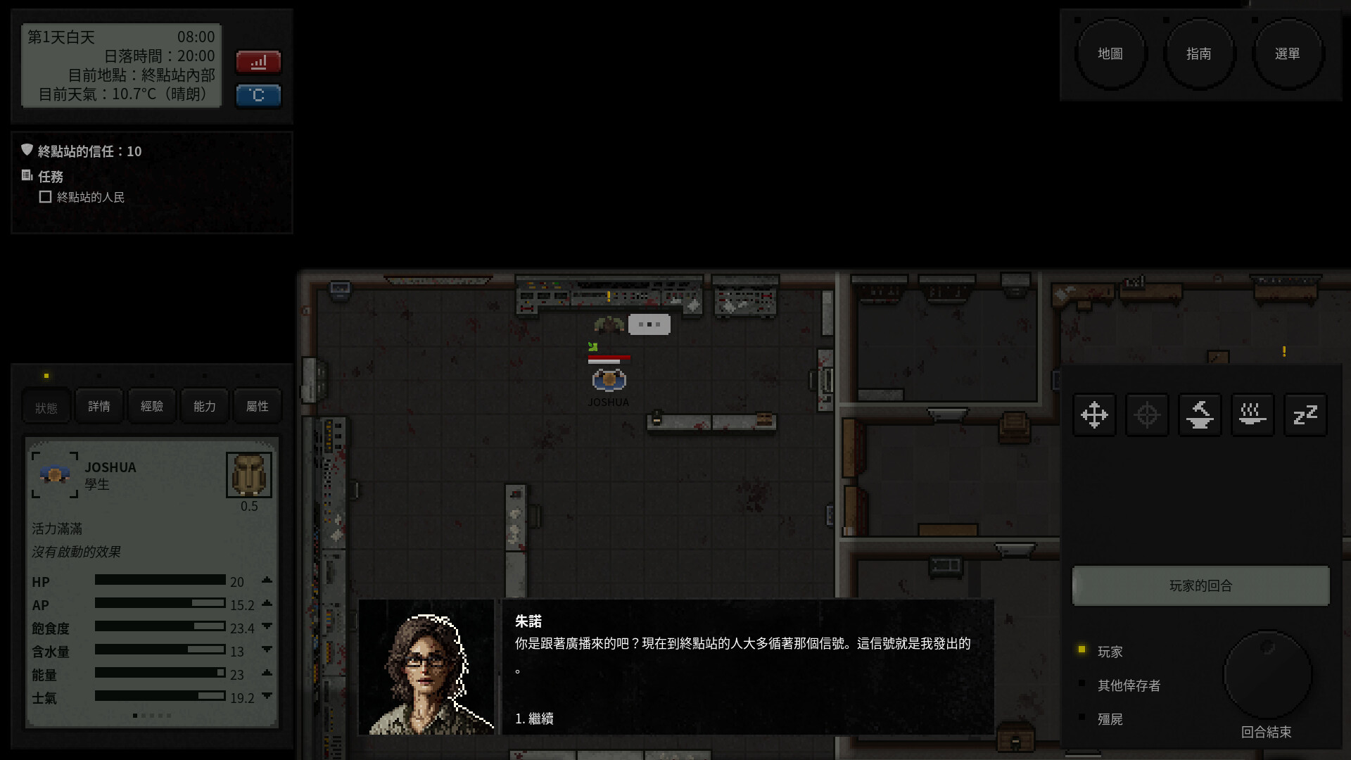 終點站的每位倖存者都有屬於他們的過往經歷和獨有的能力。有些人肩負著保衛車站的責任,也有人負責管理食物和醫療資源。和他們互動,了解他們的故事,並給他們提供協助。