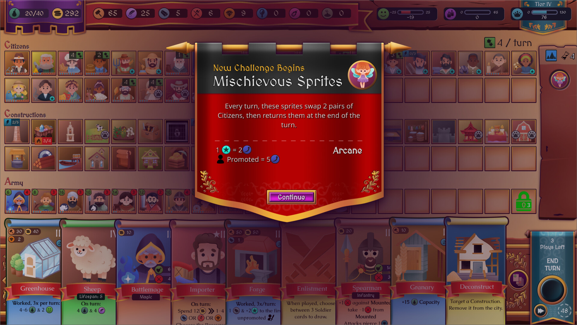 Build the perfect kingdom in this turn-based strategy game that combines elements of automation, board games, and city builders. Keep your kingdom happy, endure hostile Challenges, and unlock new cards as your kingdom becomes more prosperous.