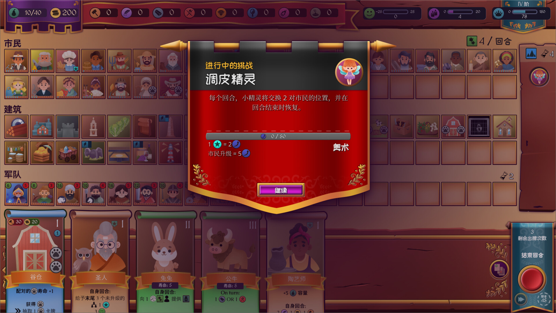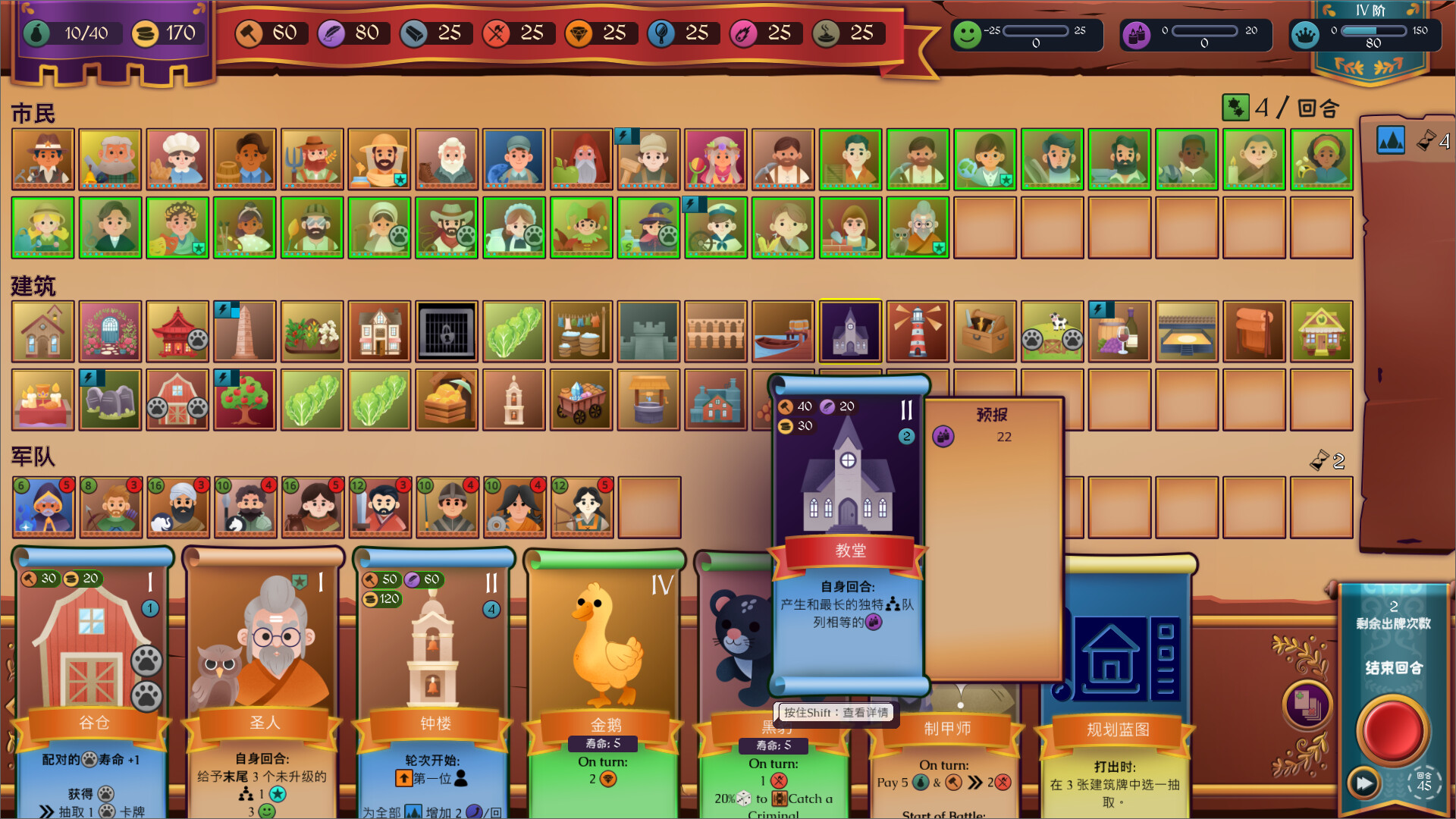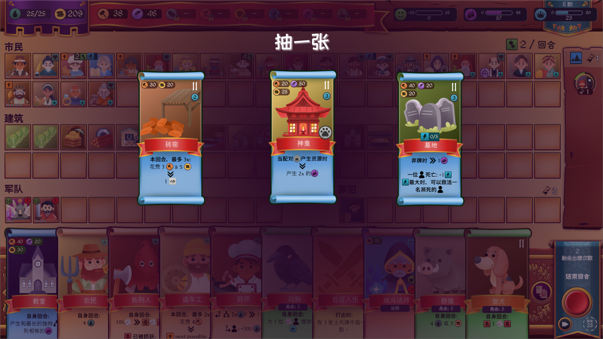大多数资源每回合都会重置。这也意味着如若无法建造想要的建筑,就不能简单地坐在原地熬工时——您需要找到王国需要做出的调整,并收集到所需的资源。小心规划市民的位置、激活连携便有可能在生产上有所突破。