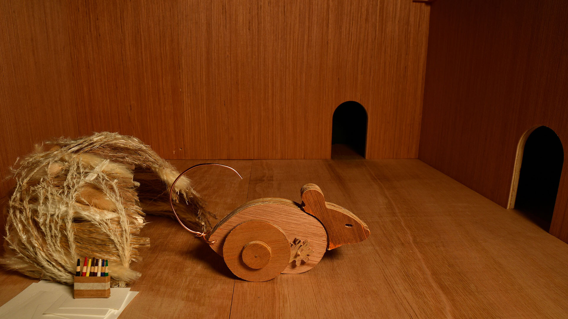 Éalú is a true stop-motion game. Every animation was captured via photography frame-by-frame using real sets, hand-crafted props, and a physical wooden mouse. Over 512 video clips were painstakingly made by a single animator — mostly in a garden shed — and brought to life in Unity by one developer carefully ensuring that each movement flowed into the next.