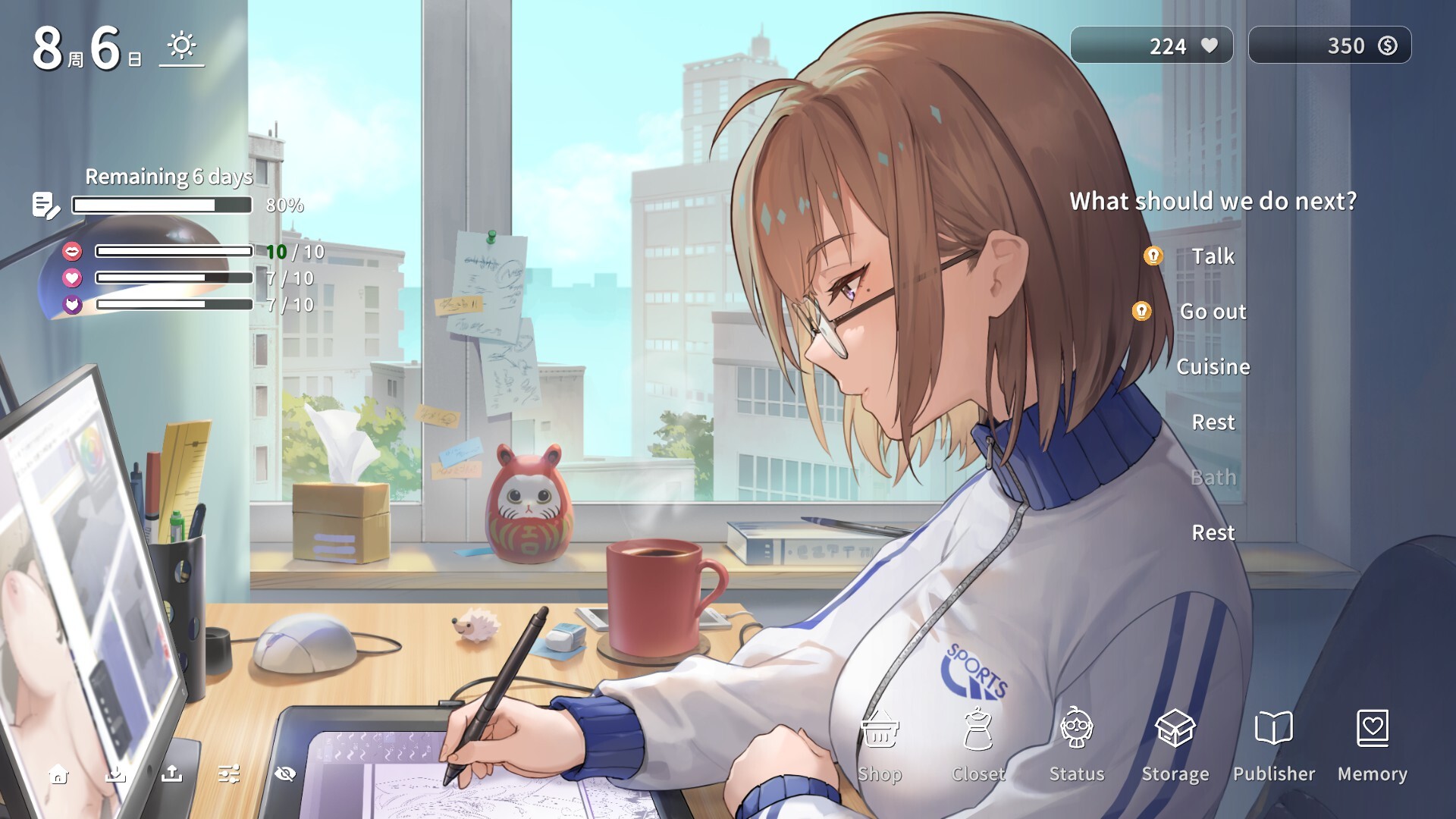Not only are you responsible for meals, but you also have to help her break through creative bottlenecks at any time—whether it's doing research at home in cosplay or going to love hotels together for "in-depth study" of character emotions...
