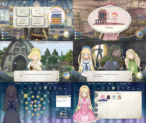本作の舞台となる魔法の国の学園では、授業やアルバイト、デートなどを通じて娘を自由に育成することができる。