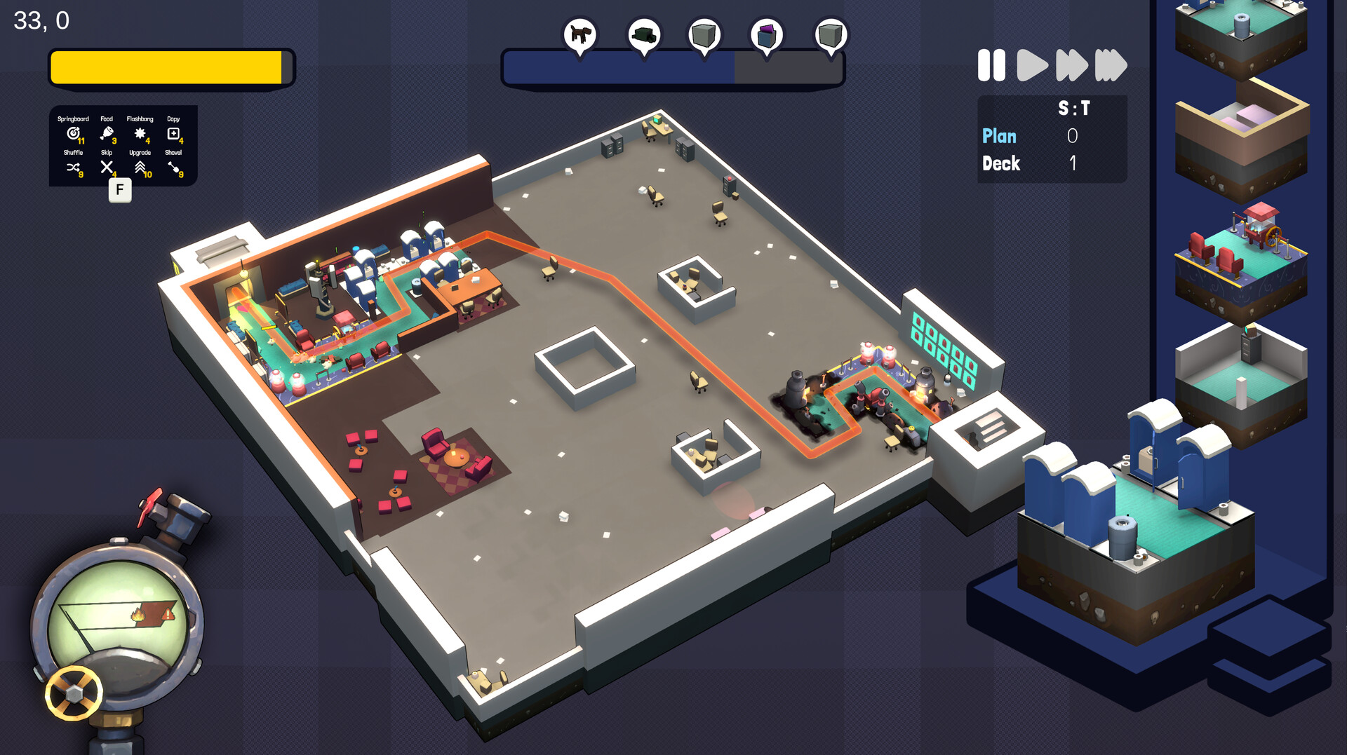Assume the role of office manager, casino mogul, or feudal lord as you force your subjects through increasingly long and complex mazes. Assault their senses with free smells and noise, or tempt them with succulent treats. But be wary: they might fight back! Workers carry battering rams to plow through your walls, meteors fall from the sky, and wayward chickens threaten to peck up your hard work. As their superior, throw flashbangs at people playing loud music, catapult the weary over walls, and distract wayward souls with hamburgers and/or ham to gain an advantage. Build fast to heat up your Heat Meter, but be careful; go too fast and you'll burn out!