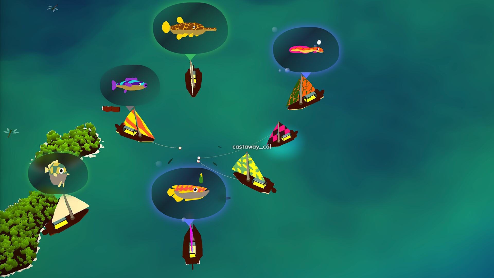 Fish a cozy pond with friends. Reel in creatures with randomized species, colors, patterns, and rare mutations — some wear tiny hats, some glow, some sprout wings. Breed new combos, display them in aquariums, and chase fish nobody has ever seen.