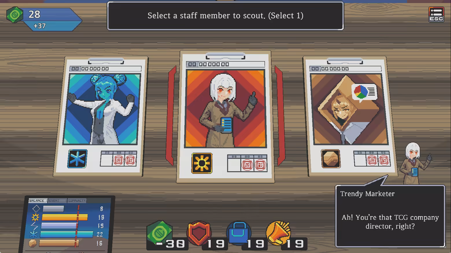 Hire staff through card battles