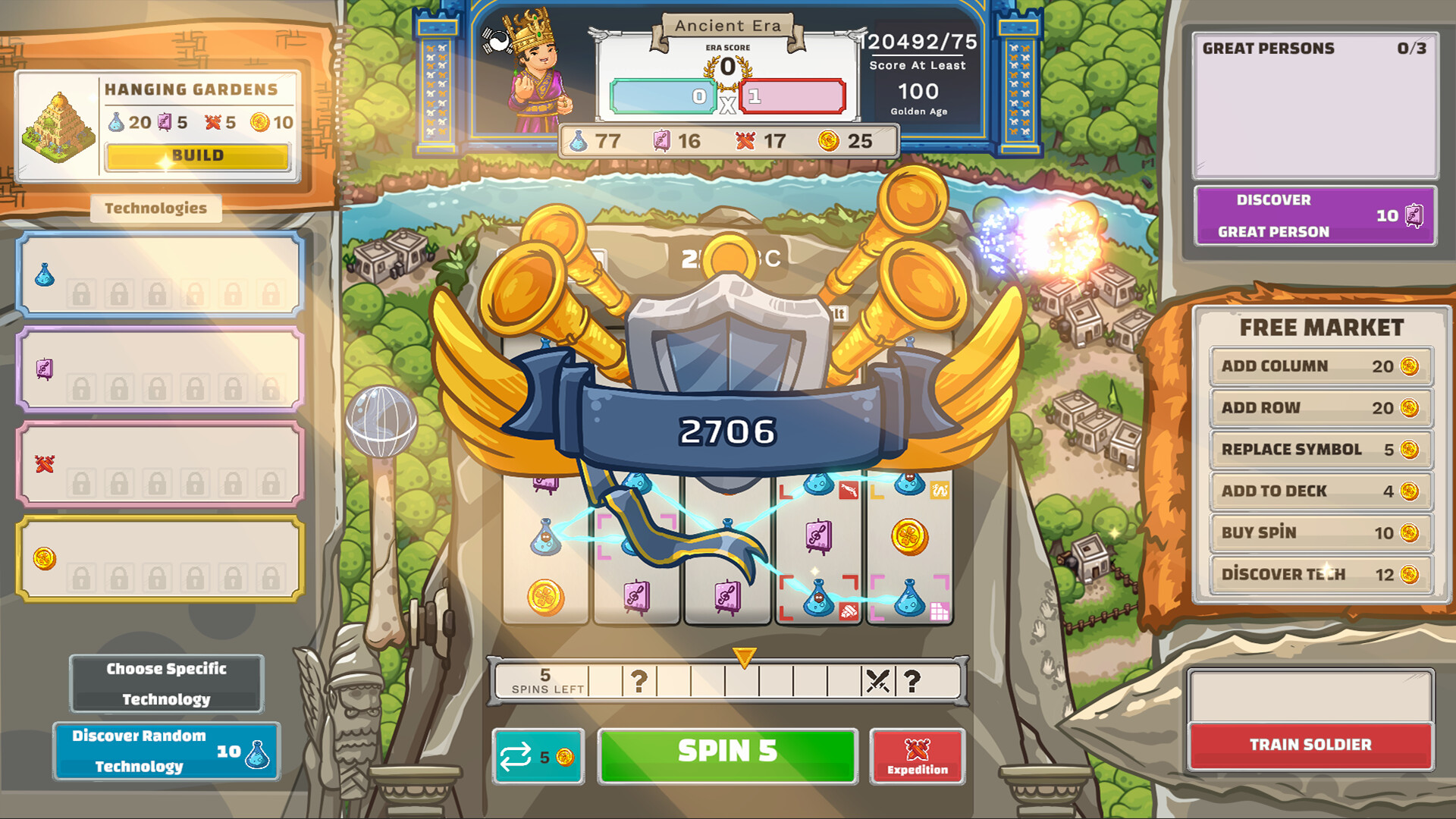 In order to beat your era score and survive through time, spin the slot machine, get resources, and combine spin results with the technologies you have discovered. Uncover new technologies, find out great persons, construct amazing wonders, and build your deck through turns. Uncover all hidden leaders and decks as you progress. You’re going to need every edge you can get in order to reach the next era for your people and to secure victory!