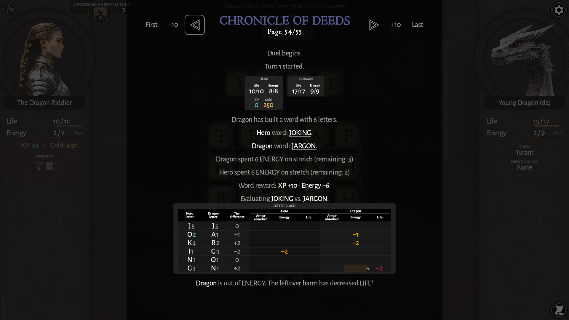When you face the dragon, a deadly word duel begins. Using letters from the Shared Letter Pool, each turn, the dragon builds a word first, but you only see its length. Build your own word to counter-attack, then observe how the letters clash in pairs as the turn resolves. Opposed letters represent both attack and defense, while unopposed ones directly damage the Life of the opponent! You can spend Energy to build words longer than your current natural ability allows. Some Energy is regained each turn, but know that Energy is also used for defense.