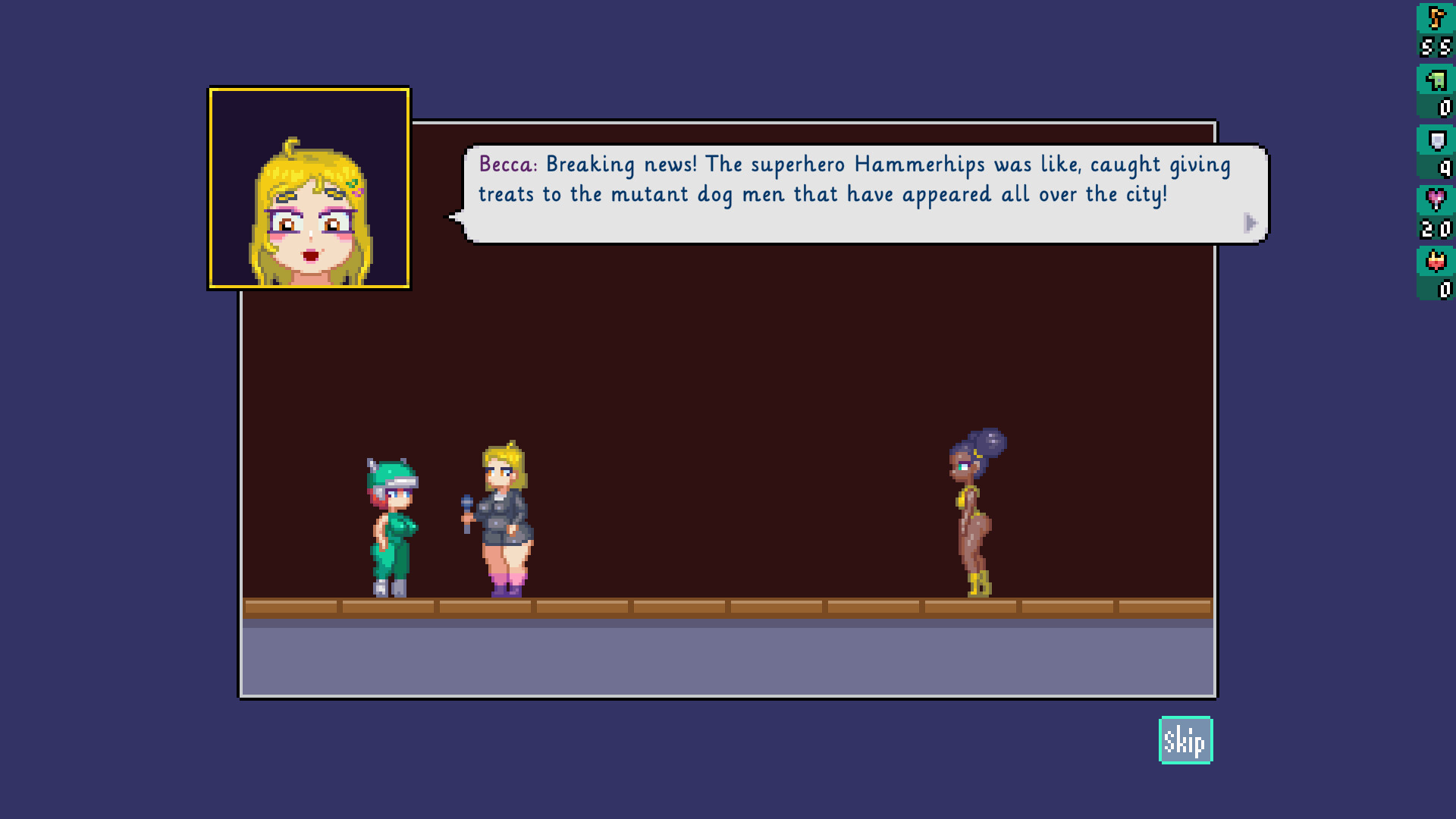Build a city on top of a UFO crash site. Your superhero girlfriend Heather will keep it safe and get herself into sexy trouble! Place new locations for Heather to visit and see what sorts of lewd events take place when she heads there on patrol!