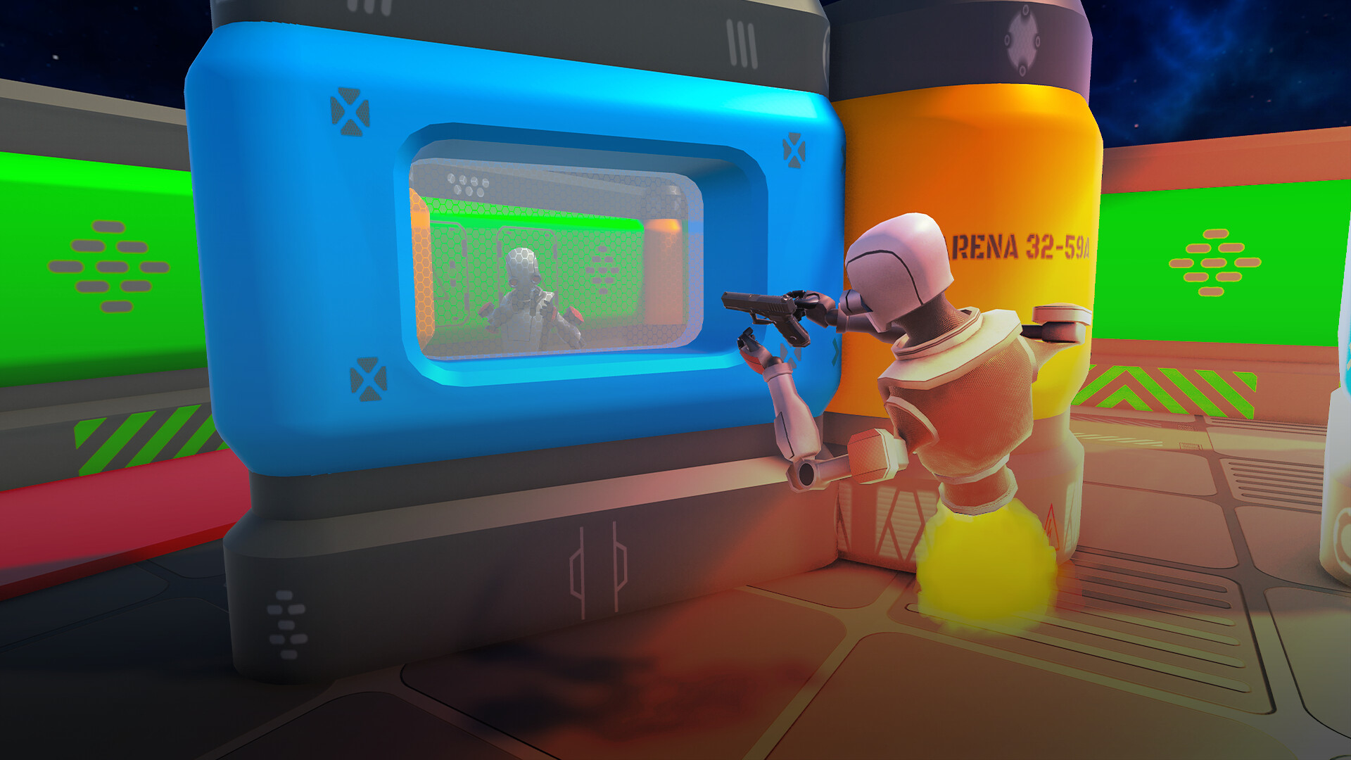 Enter a competitive VR arcade experience where real-world movement and virtual combat combine in fast-paced multiplayer battles.