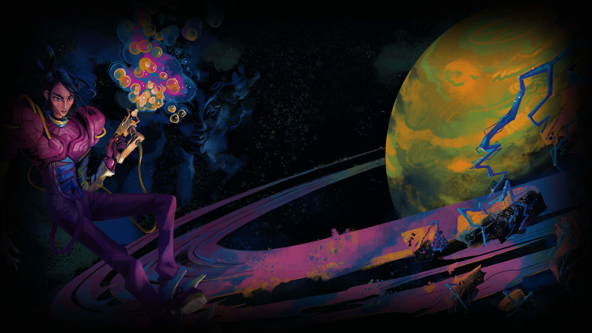 The stylized world of Ambrosia Sky is a living ecosystem with both the hostile fungus and the remnants of those who once lived there. Explore a series of environments across a range of mission types, using your tether to traverse unstable gravity fields or reach hidden passages to uncover the mystery of the Cluster.