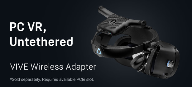 The system comes with two SteamVR™ 1.0 base stations and two VIVE controllers. It also supports accessories, such as the VIVE Trackers* for full-body tracking and the VIVE Wireless Adapter* for untethered gameplay.
