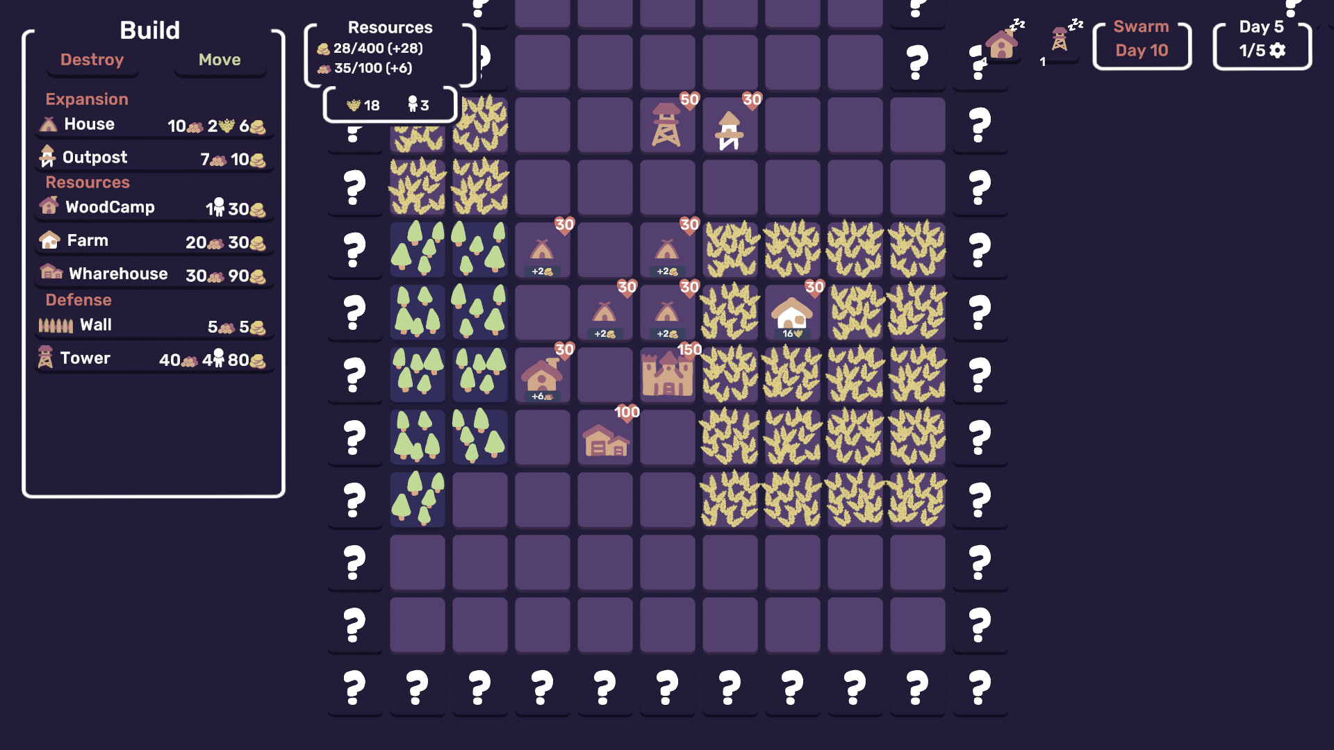 Each day, you are given a limited number of actions to carefully construct buildings, explore, gather resources, and reinforce your defenses. Every decision matters—do you invest in food production or do you prioritize settings up your defenses to prepare for the next wave?