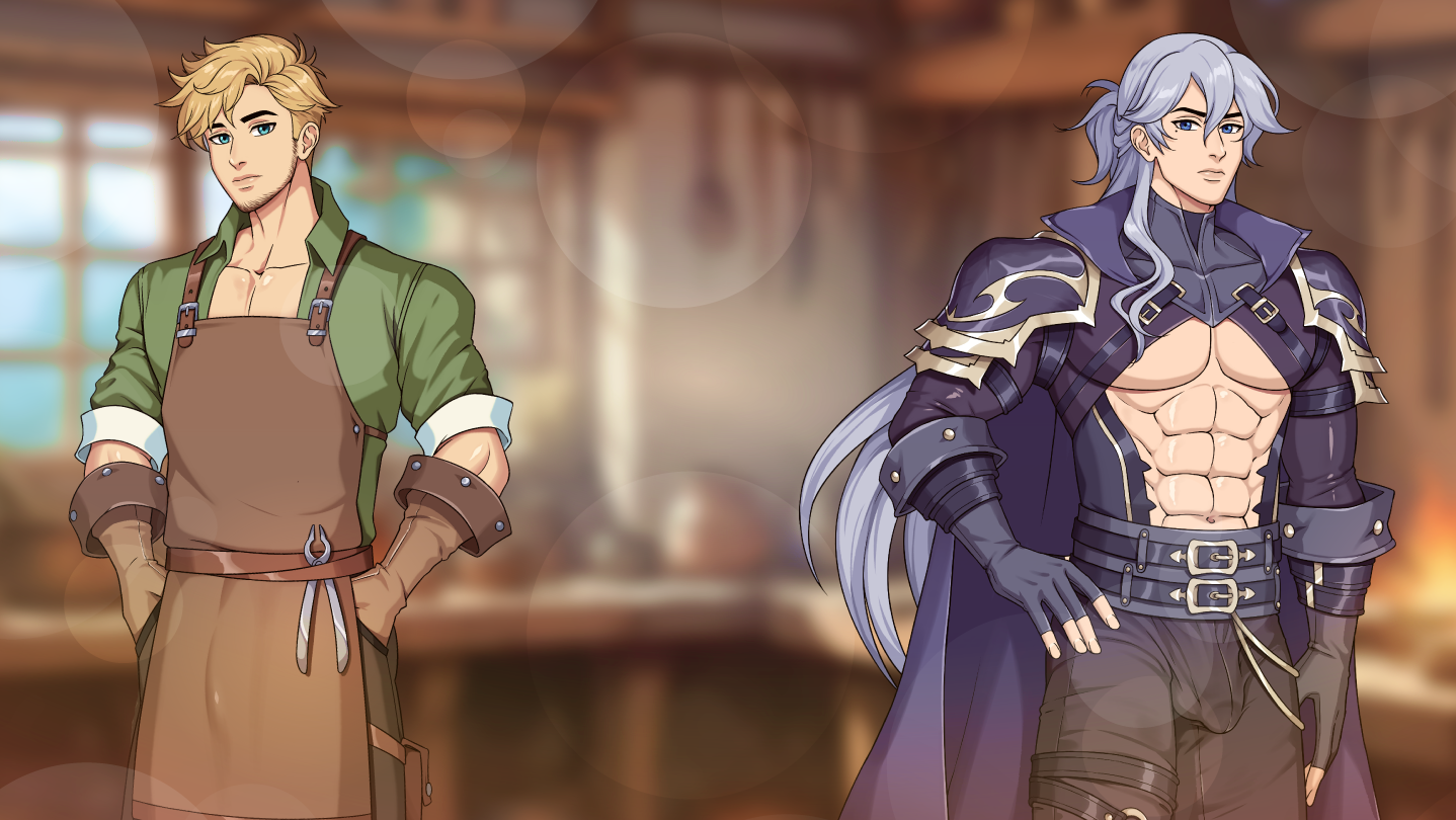 Forged Desires is a JRPG with dating sim elements and two datable guys: Leonard, the royal soldier, and Galin, the wizard. It's also based on wearing clothes to learn different skills and using different Field Skills like becoming invisible, swinging, and pushing heavy objects. The story is about a blacksmith, Alaric, who has his village destroyed by Prince Draven, and now he wants to stop his evilness.