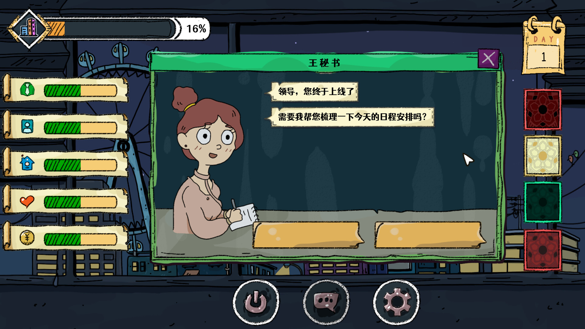 丰富的日常随机事件,通过选择不同的回应来小心平衡老板,下属,家庭,健康,金钱五个维度的数值,注意,每一次选择都可能瞬间逆转局势。