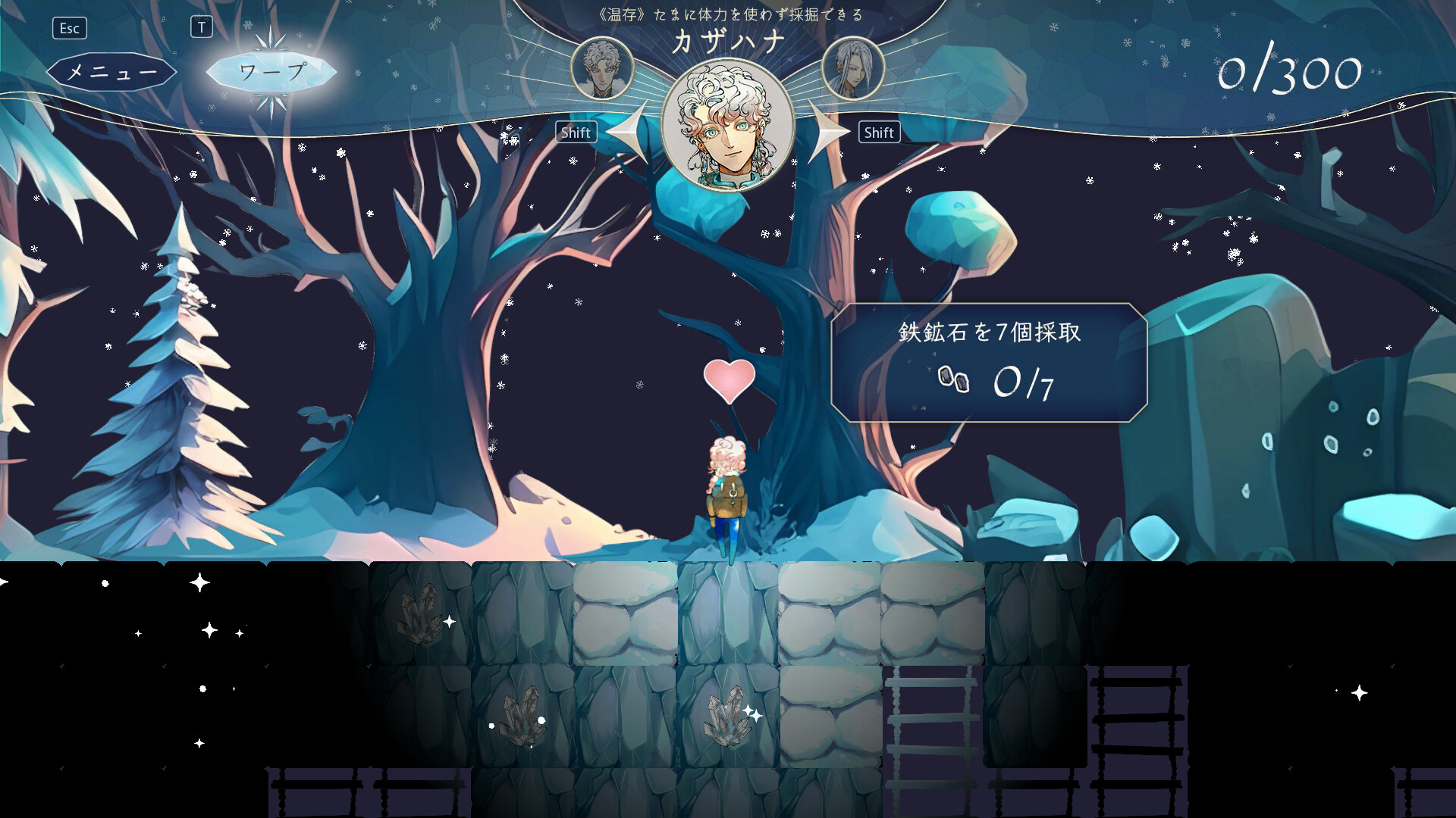 雪に覆われた鉱山の地下深くを掘り進む採掘ビジュアルノベル。