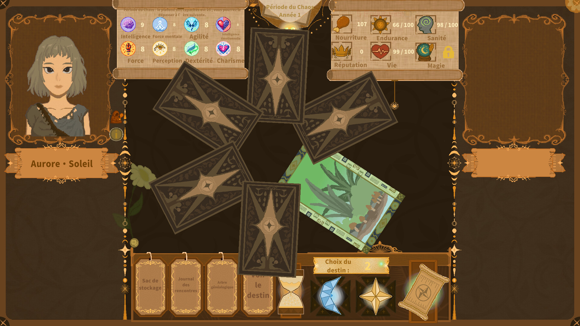 Caractéristiques initiales et huit attributs principaux se combinent pour former votre "scénario de départ" unique, influençant subtilement vos premières rencontres et relations.