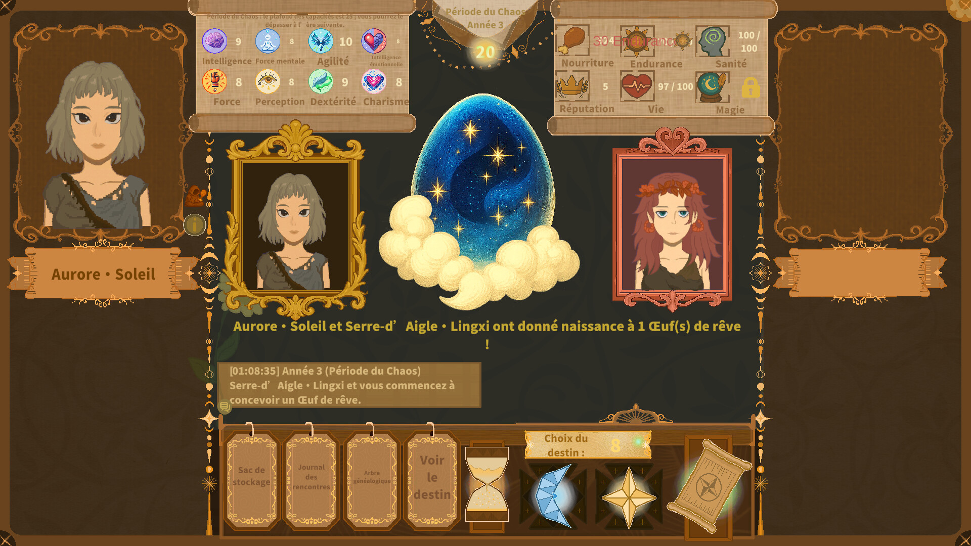 Caractéristiques initiales et huit attributs principaux se combinent pour former votre "scénario de départ" unique, influençant subtilement vos premières rencontres et relations.