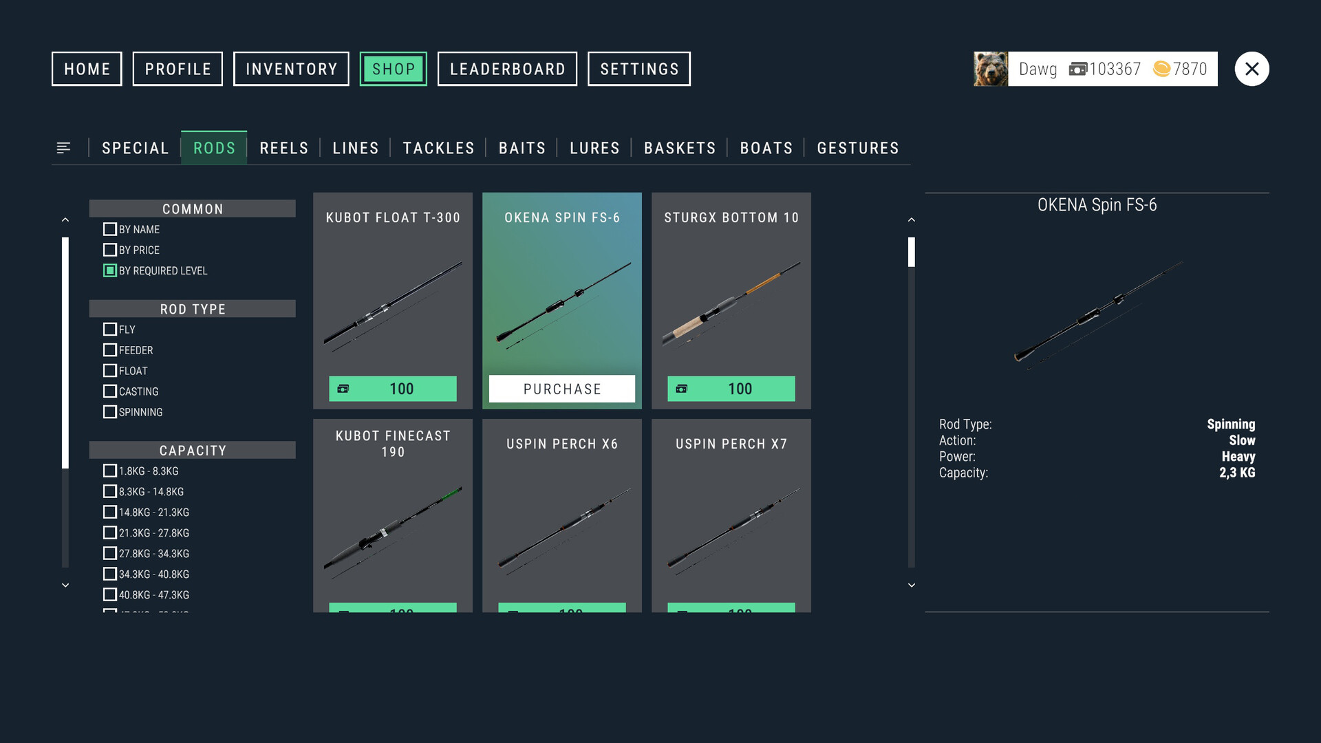 • Limited fishing gear catalog, including wear and tear system with repair mechanics