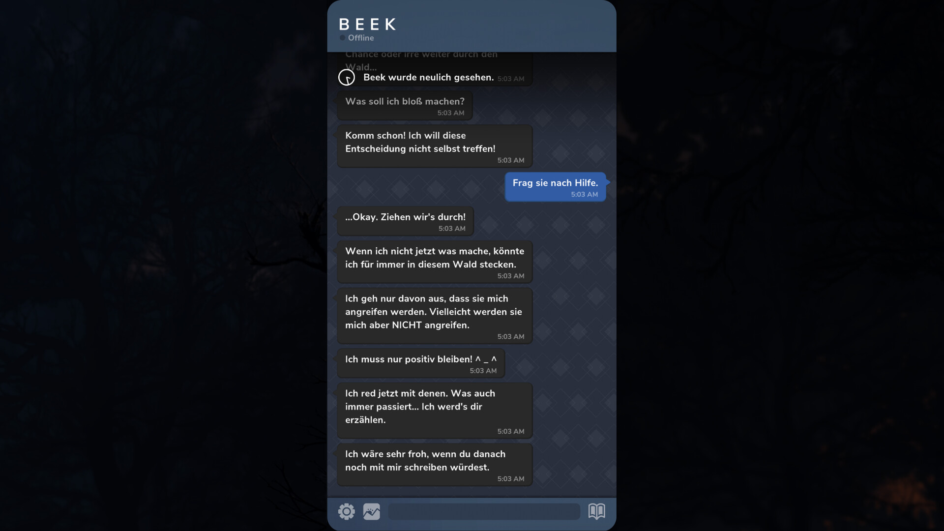 Ein Hilferuf in einem mysteriösen Messenger. Jemand hat sich verirrt und wandert durch einen Wald in einem weit entfernten Ort. Und deren Schicksal liegt in deiner Hand.