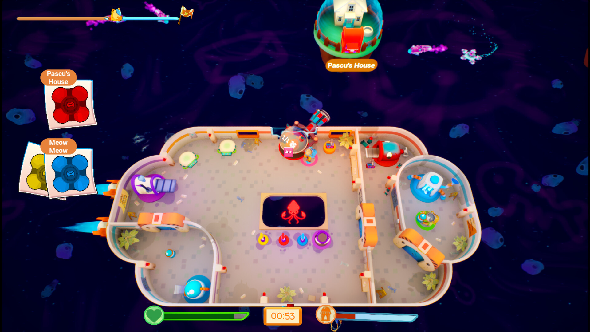 Watch out! Space is full of enemies, but don´t worry, your boss has given you just enough resources to protect yourselves. Load up the turret and shoot to defend the ship, but don´t forget: the package is what matters, and workers are replaceable.
