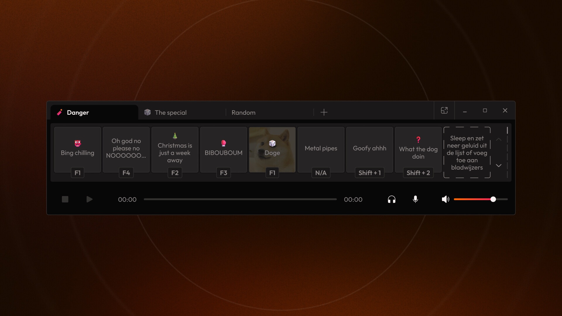 Het beste soundboard voor jouw Trol-koning talent! Speel geluiden af in elke voice chat (Discord, CS2, Fortnite, Roblox...). Voeg geluiden toe met 1-klik via de Chrome Plugin. Knip je geluiden in de app voor perfecte timing en veel meer!
