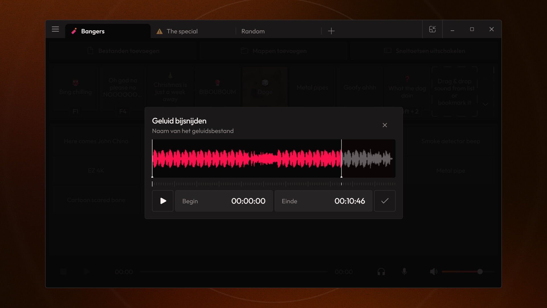 Is een geluid te lang of begint het te laat? Geen probleem. Gebruik onze geïntegreerde bewerkingstool om nauwkeurig het deel van het geluid dat je wilt afspelen te knippen en te selecteren.