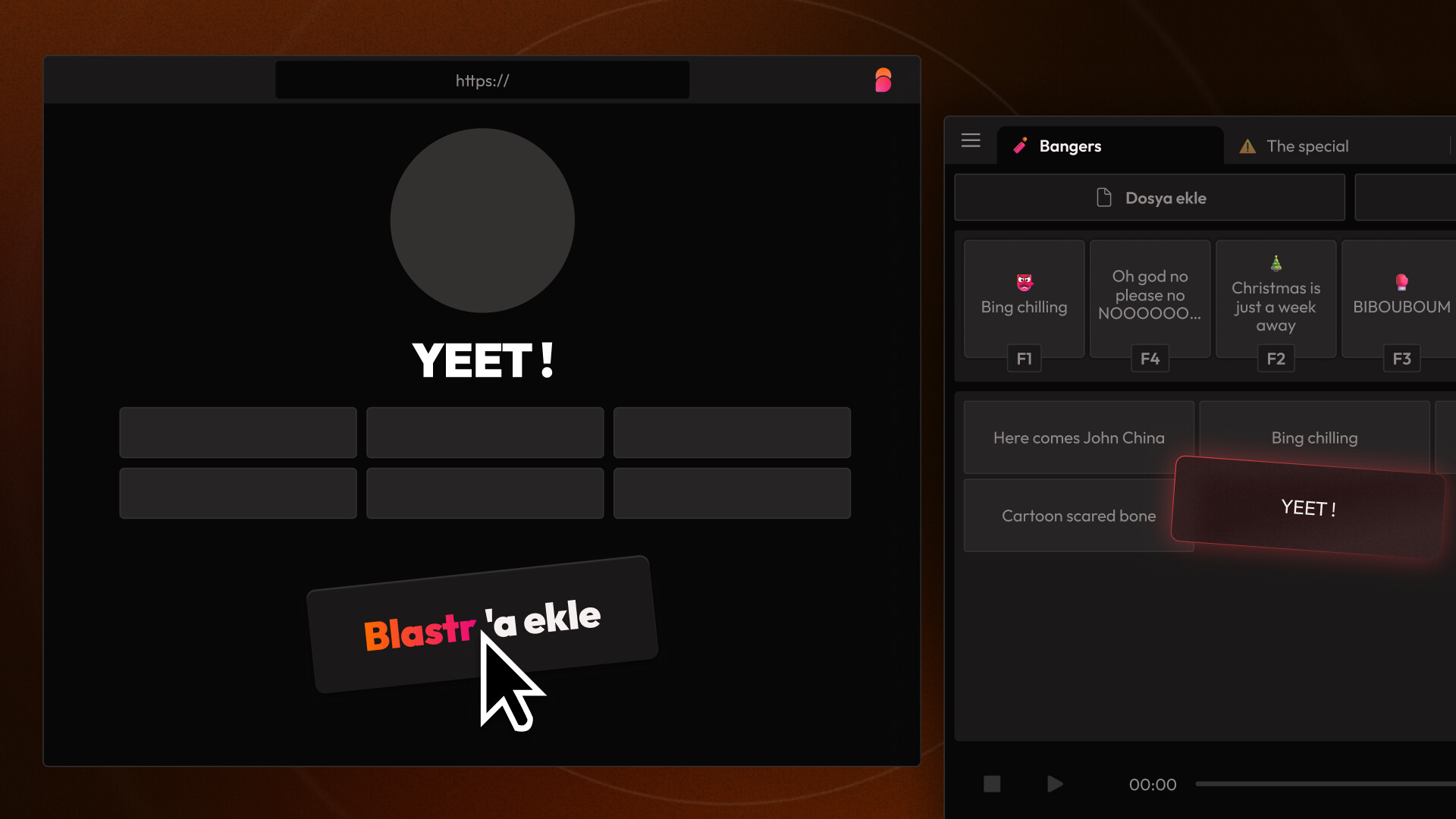 Her oyunda veya Discord sohbetinde ses çal! Bu soundboard hotkey'lerle havalı olmana, sesleri düzenlemene ve tarayıcı eklentimizle webden ANINDA ses eklmene olanak sağlıyor. Git hepsini patlat! GG EZ.