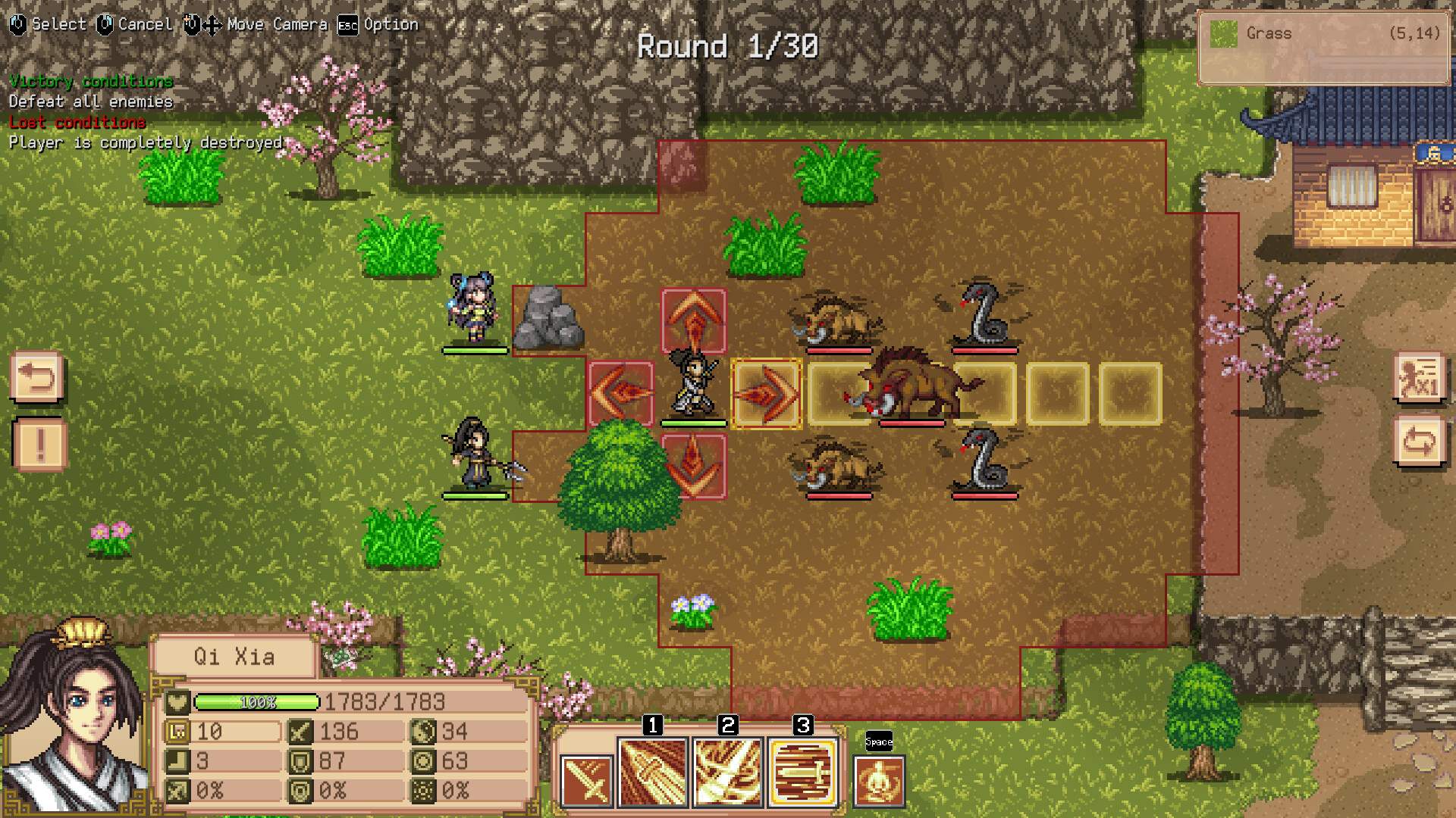 Skills can be activated using hotkeys to enter targeting mode, after which moving the cursor previews the skill's effect range. Clicking a tile immediately triggers the skill.