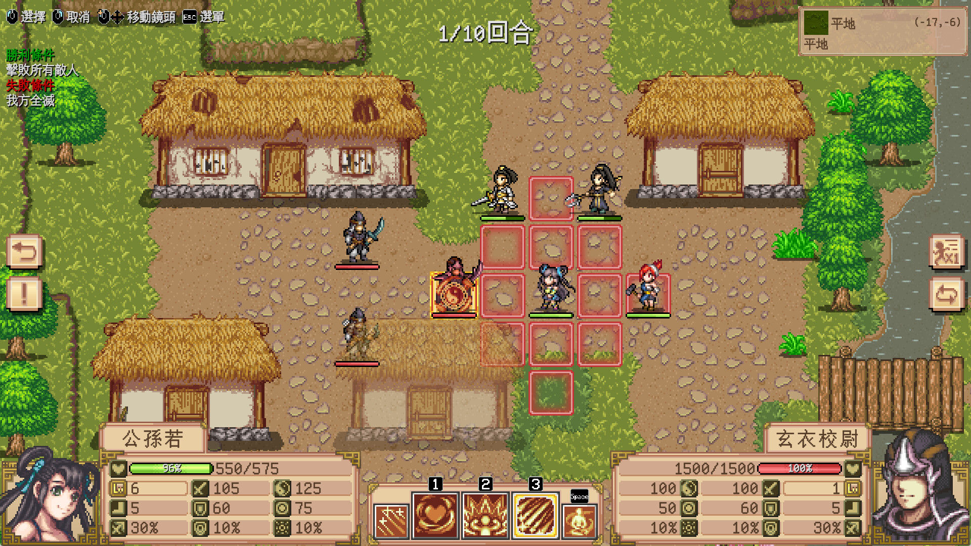 技能釋放可用快速鍵選擇技能進入釋放選點狀態,之後移動光標即可預覽技能的效果範圍,點擊地塊將立即釋放技能。
