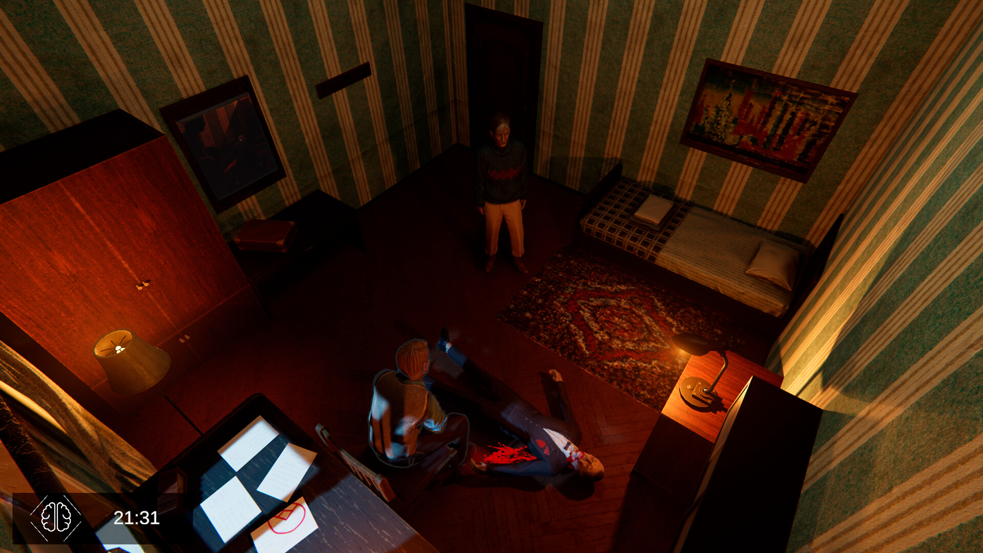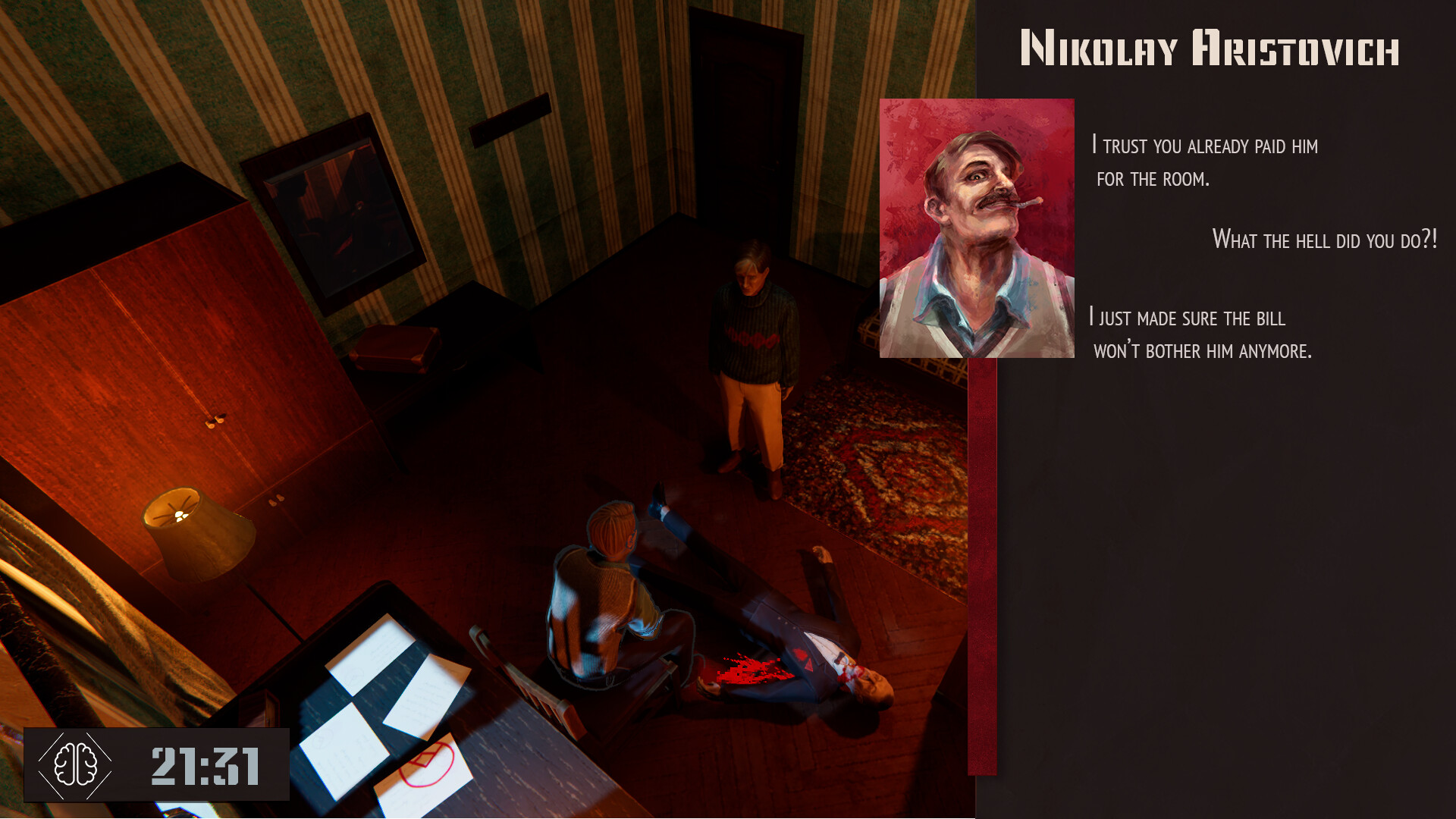 Instead of conventional skills – thinking is your tool. Investigate events, build logical chains, and formulate hypotheses. How you think influences the investigation's progress and changes the main character's personality. You can drive him insane or help him become a true detective. Be his inner monologue.