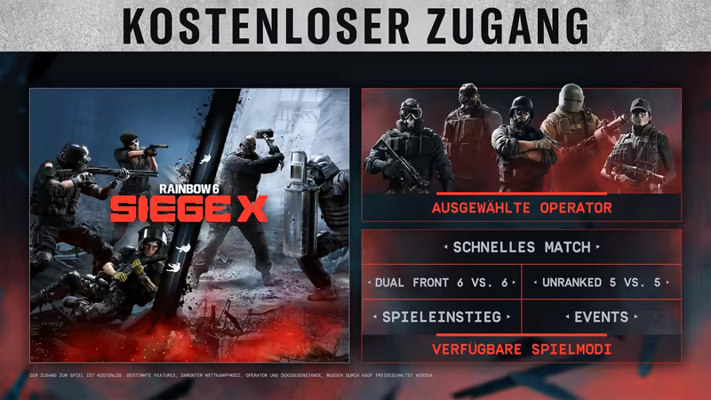 Rainbow Six Siege X ist der Maßstab für taktische teambasierte Shooter, in denen Elite-Strategie und -Durchführung den Sieg bringen. - Genießt kostenlosen Zugang zu den Spielmodi „Schnelles Match“, „Ohne Rang“ und „Dual Front“ mit einer Operator-Auswahl.