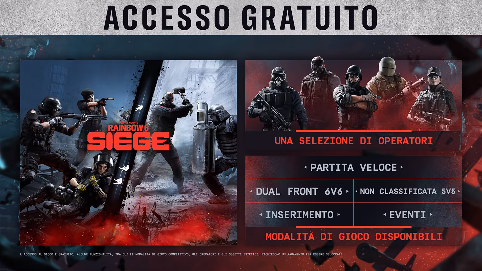 Alcune funzionalità, tra cui lista scenari Classificata, Coppa Siege, operatori aggiuntivi e oggetti estetici, richiedono un pagamento per essere sbloccate.