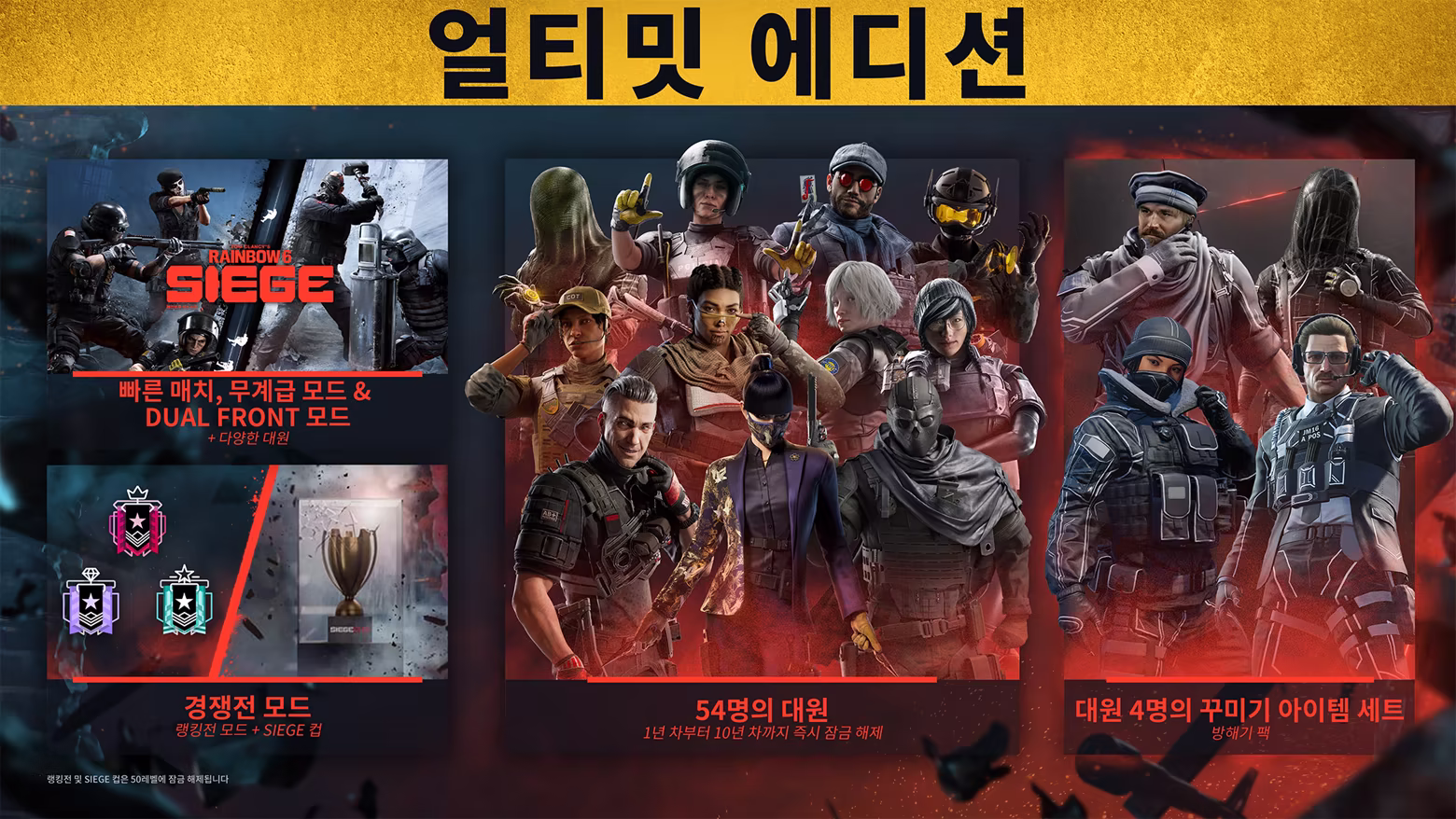 랭킹전 게임 목록, 시즈 컵, 추가 대원 및 꾸미기 아이템과 같은 특정 기능을 잠금 해제하려면 결제를 해야 합니다.