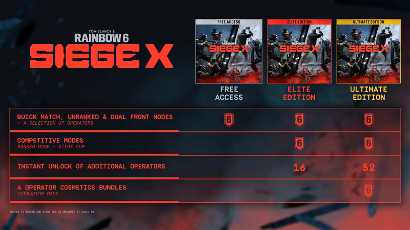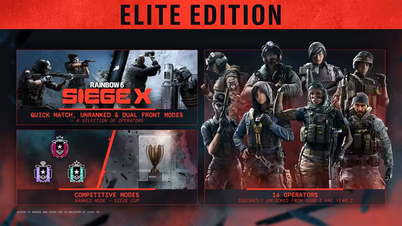 CERTAIN FEATURES LIKE RANKED PLAYLISTS, SIEGE CUP, ADDITIONAL OPERATORS, AND COSMETICS, REQUIRE PAYMENT TO UNLOCK.