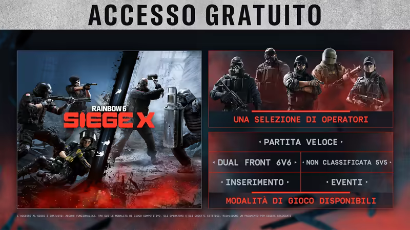 ALCUNE FUNZIONALITA, COME LA LISTA SCENARI CLASSIFICATA, LA COPPA SIEGE, GLI OPERATORI AGGIUNTIVI E GLI OGGETTI ESTETICI, RICHIEDONO UN PAGAMENTO PER ESSERE SBLOCCATE.