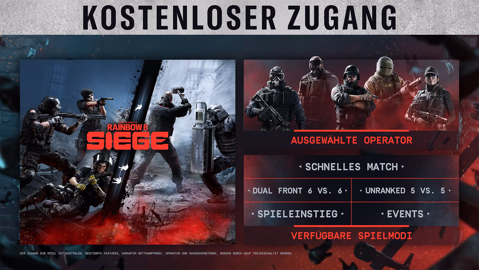 Rainbow Six® Siege ist der Maßstab für taktische teambasierte Shooter, in denen Elite-Strategie und -Durchführung den Sieg bringen. Genießt kostenlosen Zugang zu den Spielmodi „Schnelles Match“, „Ohne Rang“ und „Dual Front“ mit einer Operator-Auswahl.
