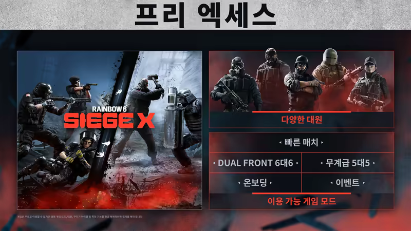 다양한 대원들과 함께 빠른 매치, 무계급, 이중 전선 게임 모드를 프리 엑세스로 이용하십시오.