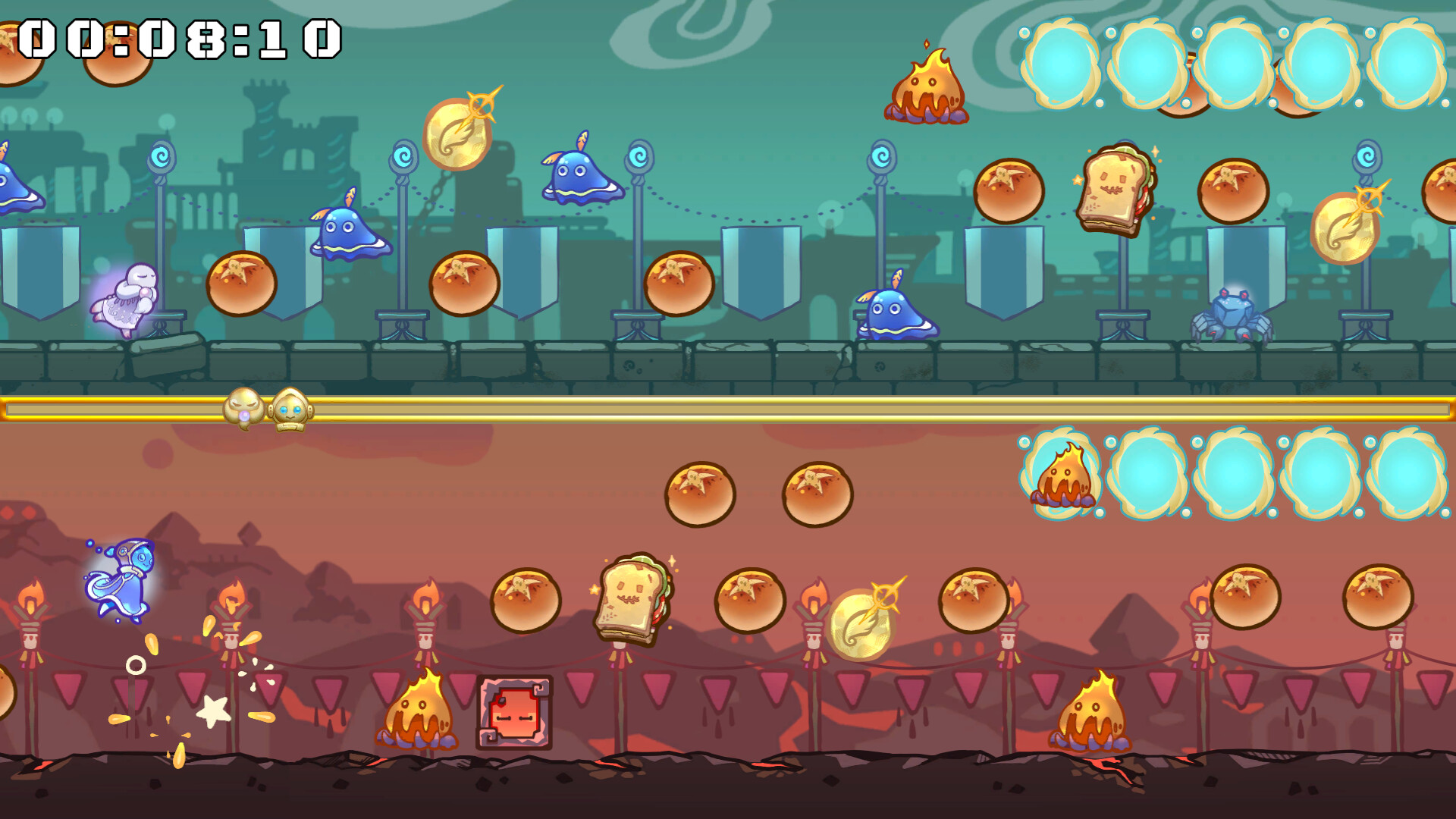A grand sports festival of spirits held once every hundred years... Here it begins!! A competitive racing game where you compete in two separate lanes! The key to victory lies in "Parry"! When an enemy appears, jump! While in the air, press the jump button again... Let's Parry!