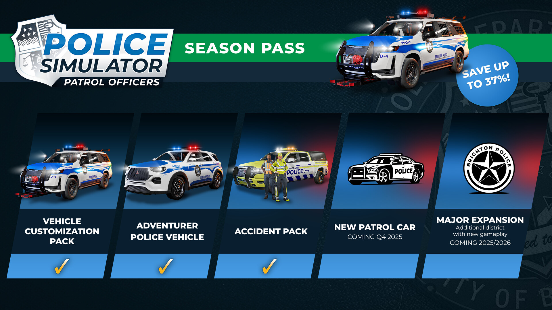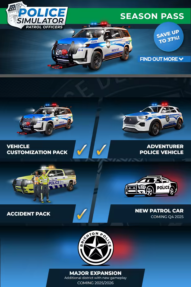 Gear up with the Season Pass for Police Simulator: Patrol Officers! Save up to 37% compared to purchasing separately, thanks to fantastic additional content. The additional content is planned for launch by early 2026 and will include a major expansion, two DLC packs, and new patrol cars.