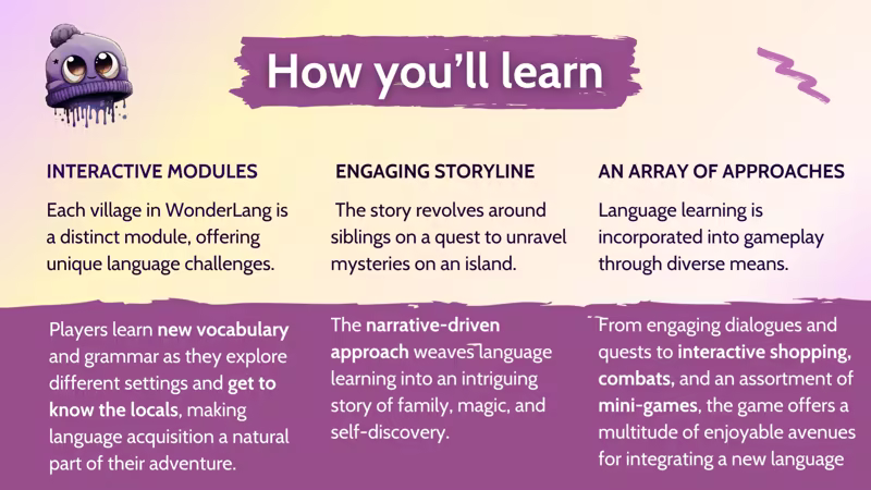 Welcome to WonderLang Polyglot, the ultimate edition of WonderLang that lets you learn multiple languages in one RPG. Immerse yourself in captivating quests, interactive dialogues, and fun puzzles designed to make language learning seamless and enjoyable.