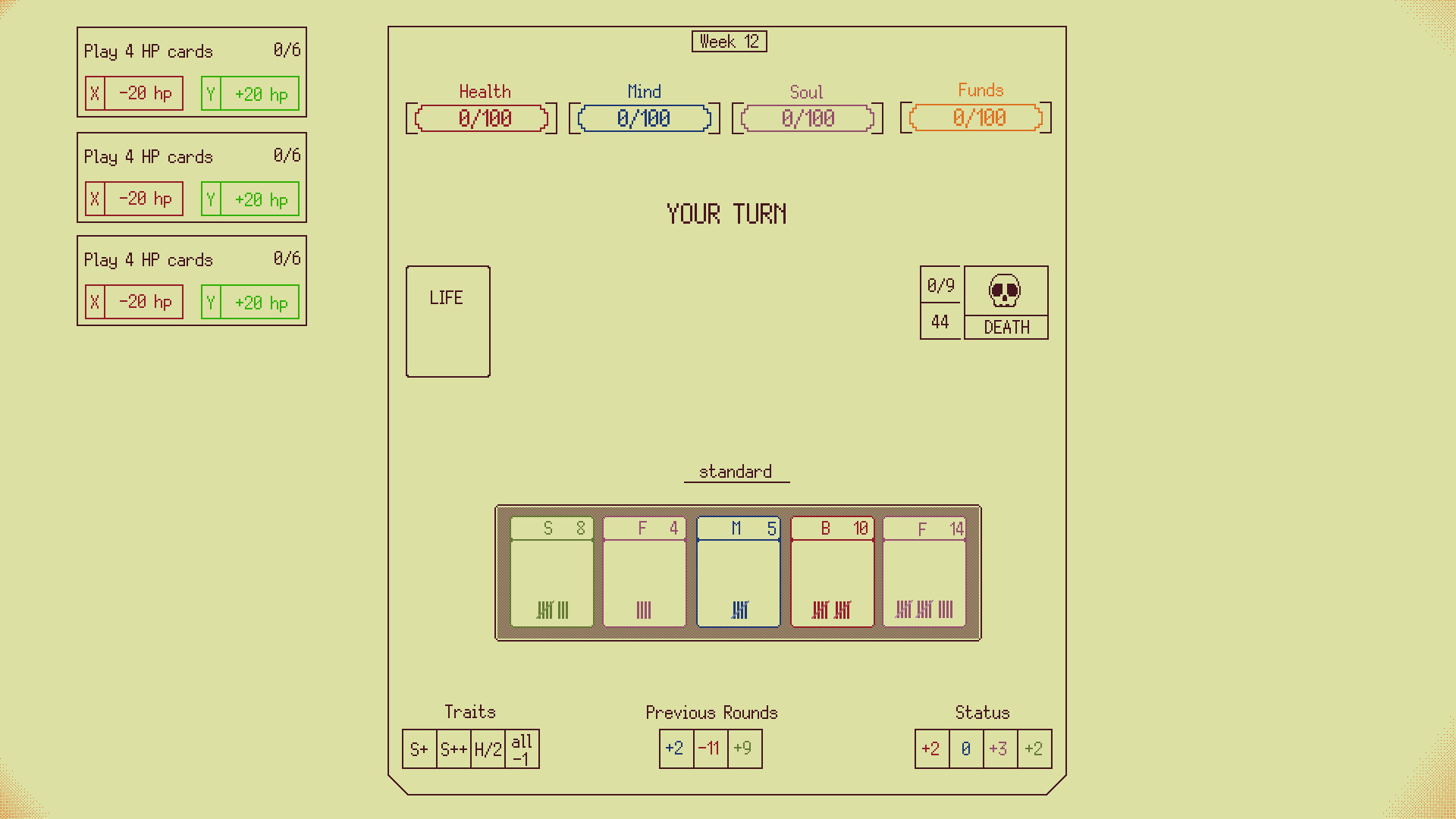 Discarding Death is a single-player card game where you face Death in daily rounds using a standard deck. Each day, you draw five cards and compare them against Death's hand. Every comparison gives you three choices — each one shifts your Health, Mental, Soul, or Funds. Keep all four above zero and you live another day.