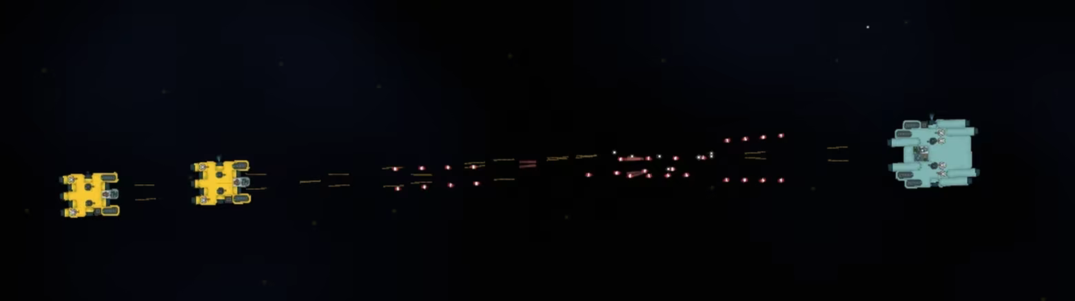 Combat is a strategic battle of attrition. Ships trade volleys of projectiles, relying on sustained firepower, resource management, and smart ship design to exhaust the enemy's ammo, fuel, and energy.