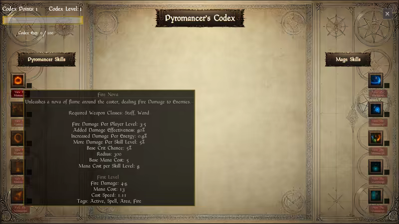 • Unlock Sub Class specific (e.g. Pyromancer) and Class specific (e.g. Mage) Skills in the Codex.