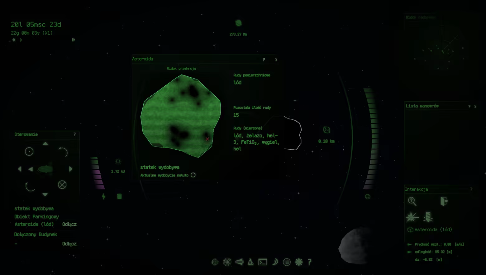 „Currently, we have implemented all the basic mechanics, including orbital mechanics, asteroid scanning/drilling/mining, ore chemical reactions, research, and space station/spacecraft building, which together enable the space simulation experience.”
