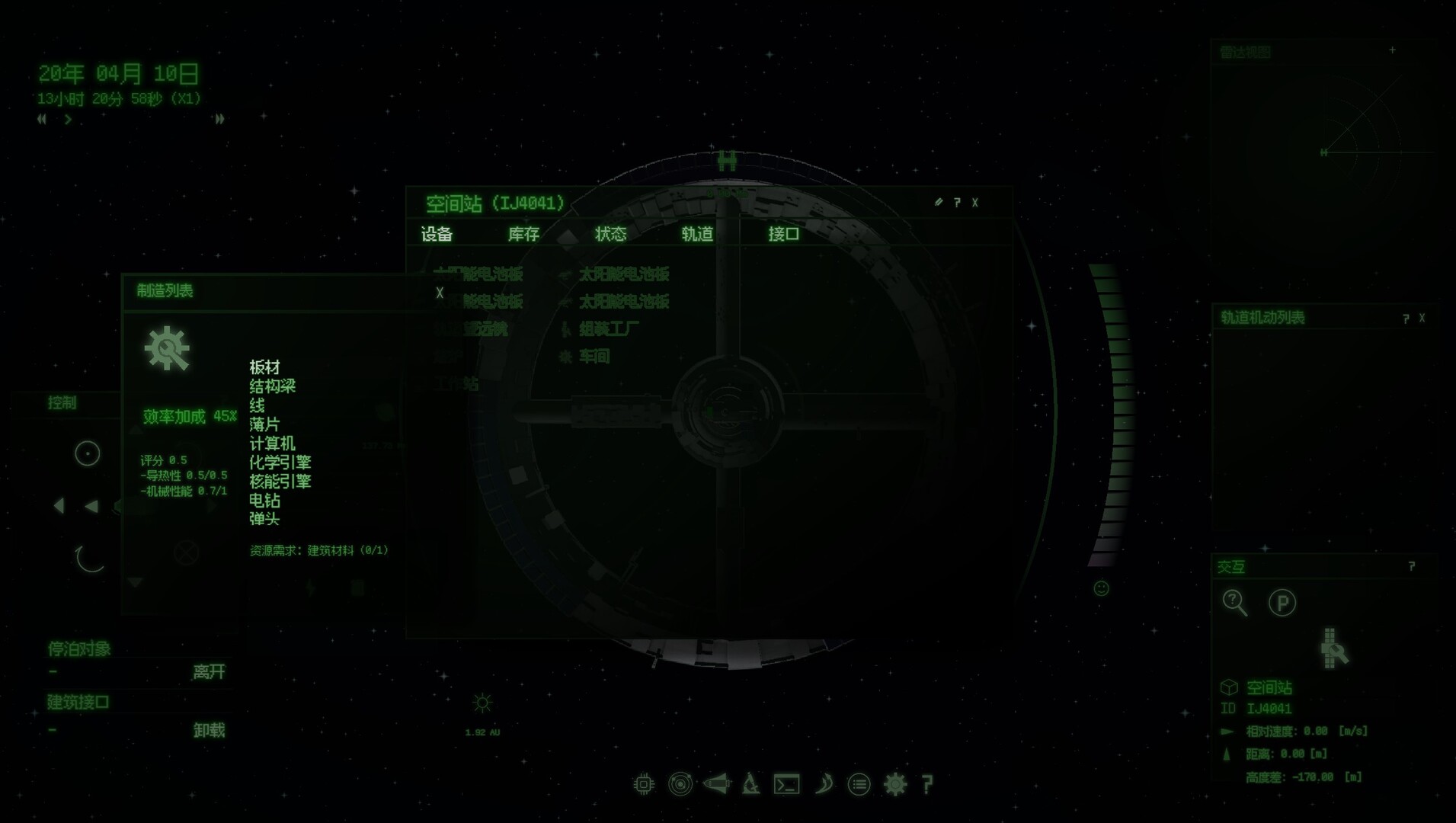 一款结合轨道力学的科幻定居点建设游戏。你将从一艘宇宙飞船开始,勘探小行星,开采矿石,收集燃料,并利用化学反应处理矿石。扩展定居点,探索未知领域,建设空间站和飞船,同时管理电力、时间和SAN值,支持你的营地的发展壮大。